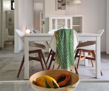 Apartamento, 60 m2, um quarto com cama de casal, casa de banho completa, sala de jantar e de estar com um confortável sofá-cama de casal grande, cozinha totalmente equipada, A/C e grande terraço mobilado. Não há elevador.
